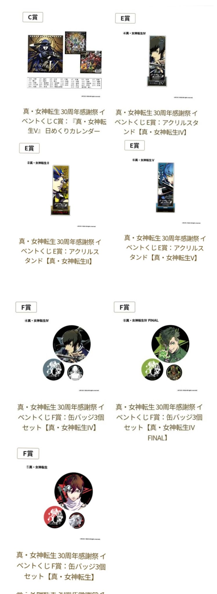 | メーカー | 真・女神転生 30周年オンラインイベントくじ F賞缶バッジ コンプリート |