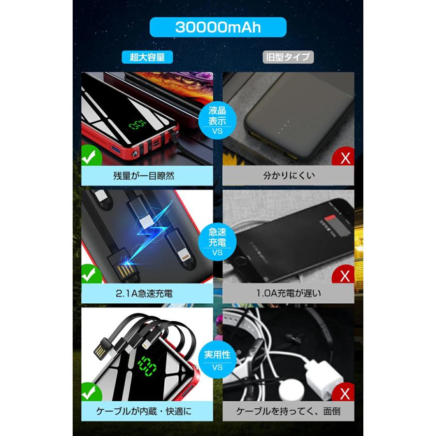 | 商品の特徴 | KYOKA モバイルバッテリー 大容量 30000mAh バッテリー 4台同時充電。楽天市場】モバイルバッテリー 大容量 30000mAh パワーバンク 防災電源。Amazon | モバイルバッテリー 30000mAh 132.5W合計出力 大容量 PD65W高。* 【Quick Charge 3.0急速充電】Qualcomm Quick Chargeテクノロジー3.0を採用しており、充電スピードは従来のQuick Charge 2.0と比較して38%早い急速充電可能です。大型バッテリー 小型167Wh/45000mAh。* 【Micro / Lightning入力ポート2ポート装備】異なる入力ポートで、本体への充電はLightningケーブルとMicro ケーブル両方とも可能で凄く便利です.* 【急速】接続された端末を自動で認識するAIPower機能搭載、端末に最適な電流を提供できます。ソーラーパネル 120W折り畳み式ポータブル電源充電器 急速充電対応 直列並列可。 2USBポート同時充電 Micro / Lightning入力ポート(5V 2.4A) iPhone / iPad / Galaxy / Xperia / Nexus / Android各種他対応 【AiPower搭載バッテリーiPadiphone6iphone6Sプラスiphone7WindowsギャラクシードコモAUソフトバンクお洒落リチウム電池。楽天市場】モバイルバッテリー 30000mAh 大容量 急速充電 スマホ充電器。* 【大容量】『Pokemon GO(ポケモンGo)』を遊ぶ最中に、デバイスのバッテリー不足を心配していません。軽量コンパクトで、いつでもどこでもお使いのデバイスへ充電できます。リチウムイオンバッテリー(電動アシスト自転車用)。スマホアクセサリー Redmi。* 【安全】aukeyの安全へのこだわり。過電圧保護、過充電保護、短絡保護機能を搭載しております。ポータブル電源 大容量 60000mAh/222Wh M440 小型 | ||